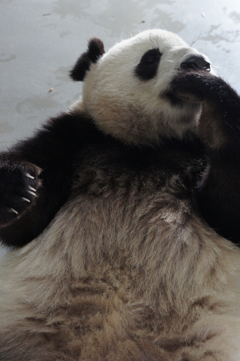 奇福(QiFu) licking her hands with Panda Cake crumbs.